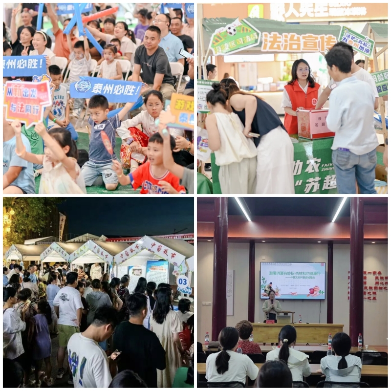热情苏超,“绿茵场”上法惠全民。借“苏超”赛事掀起的足球热,在万达广场、中骏世界城商圈线下观赛大屏前,精心打造学法摊位,用“辣么厉害”“紫定能赢”“薯你最棒”等法治助农产品,激励现场观众在趣味比拼中掌握法律知识,活动现场吸引200余人次参与互动,发放宣传材料200余份、法治助农产品100余份。三河法治文化公园全天候免费开放2处5人制笼式足球场地,为海陵足球爱好者一展球技提供难得的理想空间,与此同时公园布展了法治典故、习近平法治思想、体育法等内容,以石刻、雕塑、彩虹隧道等景观小品,将法治元素与园内花草树木、健身步道等融为一体,共同掀起一场集体育、法治、亲子于一体的夏日足球盛宴。